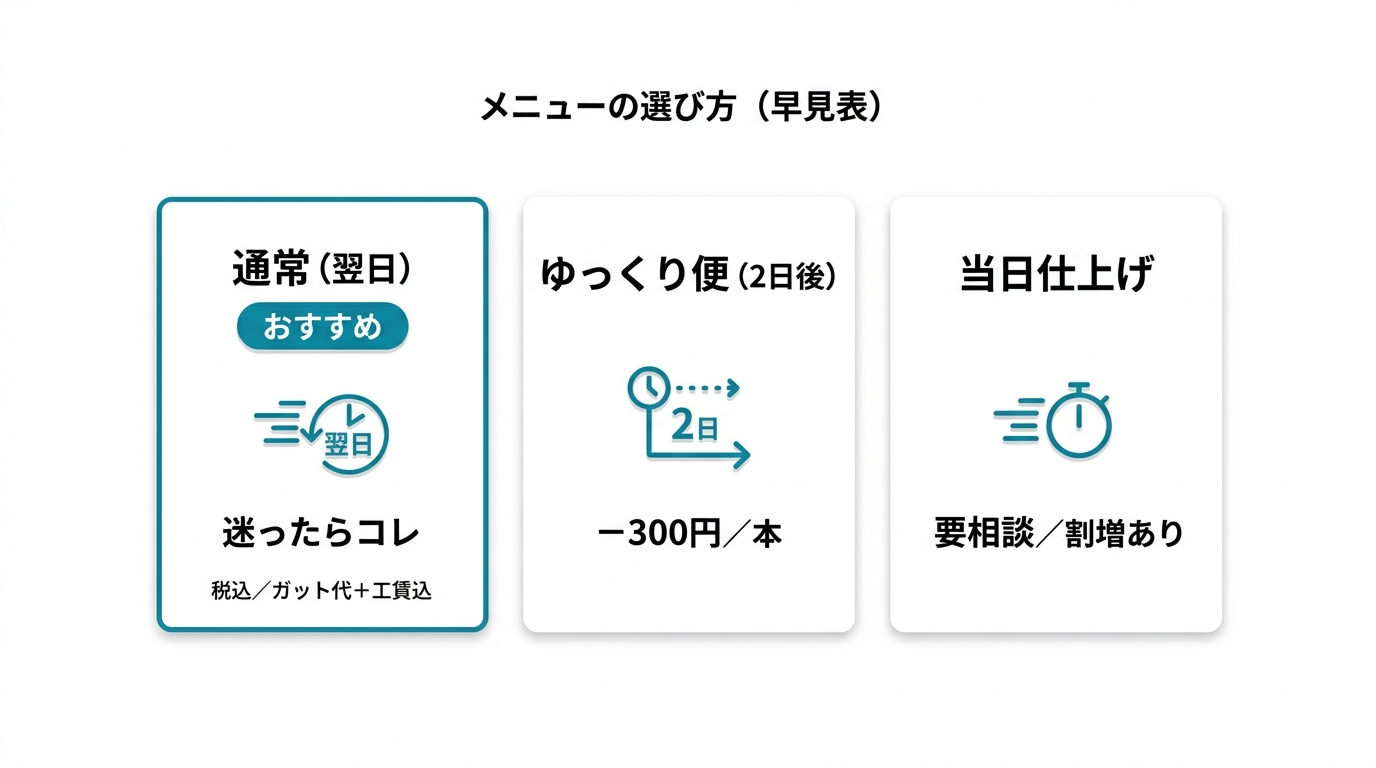 • 少しでもお得にしたい → ゆっくり便(2日後仕上げ:−300円/本)
