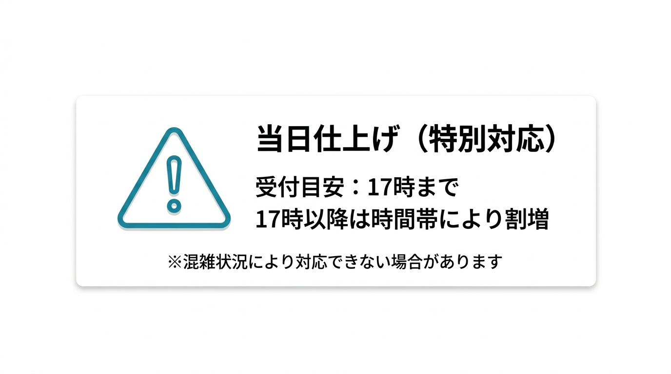 • 今日中に必要 → 当日仕上げ(要予約・特別対応/割増あり)
